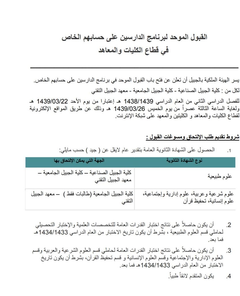 الهيئة الملكية بالجبيل On Twitter اعلان القبول في كليات ومعاهد الهيئة الملكية بالجبيل لبرنامج الدارسين على حسابهم الخاص للفصل الدراسي الثاني 1439 1438 Https T Co Kqfqfo5tve